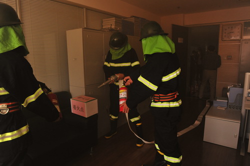 當(dāng)日下午14:30在總指揮的號令下演習(xí)正式開始。912辦公室發(fā)出火警報(bào)警信號,確認(rèn)火情后,立即啟動(dòng)消防應(yīng)急預(yù)案。警戒組、滅火組、疏散組、救護(hù)組人員按消防應(yīng)急預(yù)案迅速出動(dòng),第一時(shí)間到達(dá)火災(zāi)現(xiàn)場。大廈業(yè)主在演習(xí)疏散組人員的正確引導(dǎo)下,用濕毛巾或濕衣物捂住口鼻,從消防樓梯快速有序地撤離,成功“逃生”至安全地帶。同時(shí)滅火小組迅速打開消防栓,甩水帶、裝水槍頭,啟動(dòng)水閘開關(guān),動(dòng)作干凈利索,成功撲滅火災(zāi)。