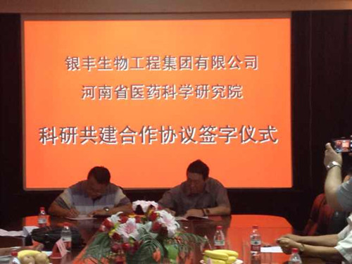 2014年7月8日,銀豐生物集團與河南省醫(yī)藥科學(xué)研究院合作協(xié)議簽約儀式在鄭州市隆重舉行,生物集團總裁生德偉與河南省醫(yī)藥科學(xué)研究院院長楊波共同簽署了共建協(xié)議。河南省科技廳社發(fā)處處長楊光、鄭州大學(xué)副校長???biāo)、別榮海、科技處處長趙明皞受邀參加簽約儀式。楊光處長在儀式上發(fā)表重要講話,介紹了目前科技部在各省設(shè)立人類遺傳資源庫的政策,表示銀豐生物集團與河南省醫(yī)藥科學(xué)研究院強強聯(lián)手共建河南省人類遺傳資源庫是利國利民的好事,科技廳將給予大力支持。